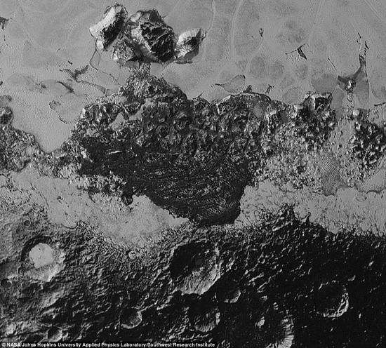图片上那片辽阔的冰原名为斯普尼克平原,它的东面有一块明亮的区域,上面似乎也覆盖着冰层。这些冰可能早先从斯普尼克平原上蒸发,然后又在东部地区重新凝结成冰。