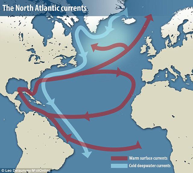 所谓的大西洋经向翻转环流可将温暖的海水输送到高纬度地区,给高纬度地区提供温暖。如果大西洋经向翻转环流出现异常,那么温暖的表面流就无法进入高纬度地区,短期内可造成某些地区更加寒冷,远期可影响北大西洋的气候。科学家研究发现,在过去数百年内,大西洋经向翻转环流出现了放缓的迹象,来自格陵兰冰盖融化的淡水冲击着大西洋经向翻转环流。北大西洋的东部地区几乎依赖着大西洋经向翻转环流,如果后者出现异常,那么那些地区的冬天会更冷。
