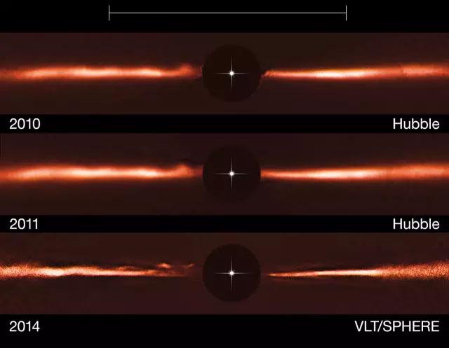 尘埃盘由里向外分布着五条波状的拱形结构,酷似水中的涟漪。拍到了这个特征后,科研人员调用了哈勃太空望远镜2010和2011年拍摄的照片,想要看看当时是否也拍到了相似的东西。结果发现,这些结构特征不但存在于早前的哈勃影像中,而且它们还会随着时间的推移发生变化。也就是说,这些涟漪会移动,而且速度非常之快!