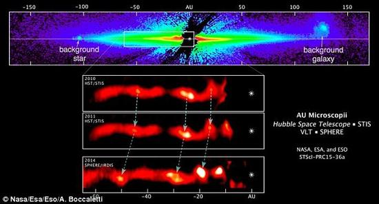 欧洲南方天文台甚大望远镜利用安装的分光偏振高对比度系外行星研究仪捕获到了一些图像。通过研究这些图像,天文学家发现了一些无法解释的特征。尽管这些特征看上去像是一些波纹,但是直到利用美国宇航局哈勃太空望远镜对其进行再度处理后,研究人员才能够看到它们移动的方式。拍摄于2010年到2011年之间的哈勃图像,不但揭示出一连串的波形弧,还有助于天文学家观察研究它们在这段时间内飞速穿越星周尘盘时的变化过程。