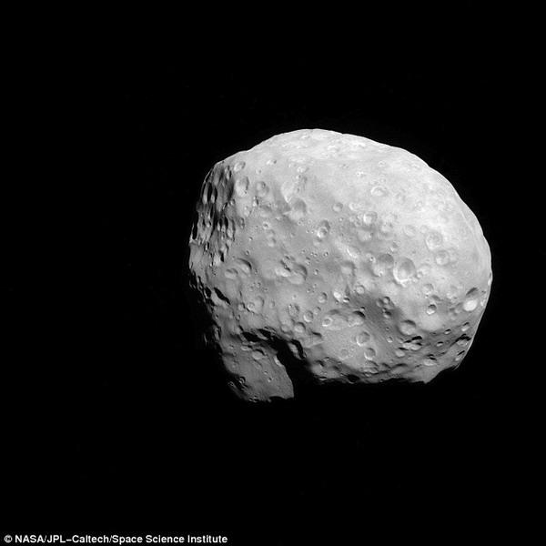 这张照片是12月6日卡西尼探测器飞越土卫十六表面时拍摄的,图中显示土卫十六一侧位于土星背面,朝向北部偏上位置。土卫十六具有独特的细长外形,美国宇航局科学家将其形容为“长着眼睛的土豆”。