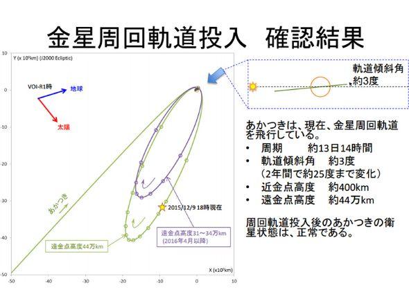 目前“拂晓”号的工作轨道为近金点(距离金星最近点)400公里,远金点(距离金星最远点)44万公里,绕金星公转的轨道周期为13天14小时。目前探测器各项状态正常,JAXA将于2016年4月开始降低“拂晓”号轨道,进入远金点约31至34万公里,公转周期约为9天的椭圆轨道。