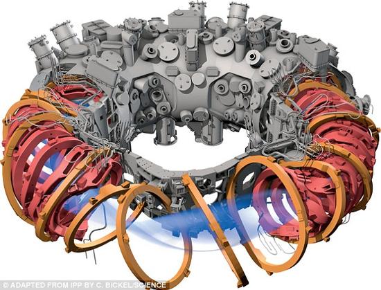 类似W7-X这 样的核聚变反应堆,采用的是两种氢的同位素——氘和氚——的原子,这些气体被注入一个密闭室。接着,科学家添加能量,将气体原子的电子移除,生成等离子 体。这些等离子体能释放出巨大的能量。在密闭室周围环绕着超导线圈,可以产生强磁场。通过电流的引导,强磁场穿过等离子体,使其远离密闭室的内壁。