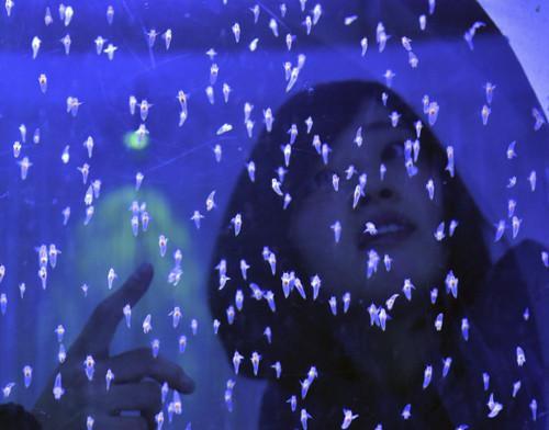 据报道,在馆内的巨大水槽里。约有1000多条冰海精灵悠然地游弋着。水槽外则是大批前来参观与拍照的游客,欣赏着这罕见的场景。
